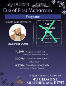 Eve of 1st Muharram + Add to Google Calendar + iCal / Outlook export Date Jul 18 2023 Expired! Time 7:15 PM - 9:00 PM Category NEJAF events Regular Programs Share this event