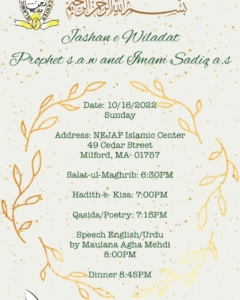 Jashne Wilaadat Prophet Muhammad saww and Imam Jaffer Sadiq as + Add to Google Calendar + iCal / Outlook export Date Oct 16 2022 Expired! Time 7:00 PM - 9:00 PM Category NEJAF events Regular Programs Share this event