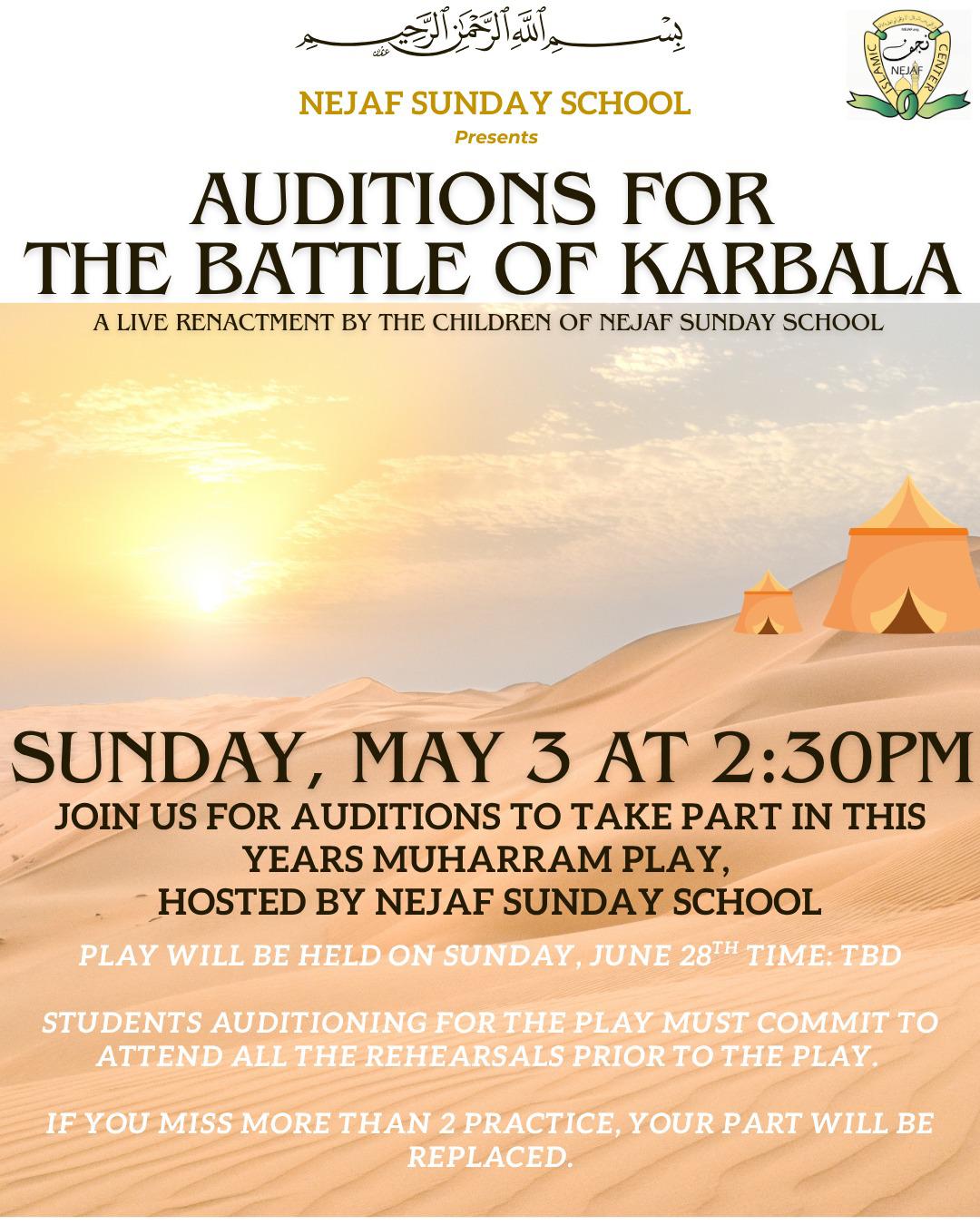 We will be holding auditions for our upcoming month of Muharram 2026 Play after Sunday School this Sunday, 5/3 at 2:30 PM, insha’Allah. This is a great opportunity for our students to participate and help us prepare something meaningful in time for Muharram. We encourage everyone who is interested to join and be part of the practice so we can be well prepared. Looking forward to seeing you all there, insha’Allah!