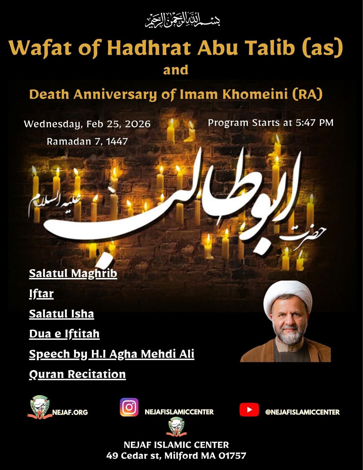 Wafat: Hazrat Abu Talib (AS) + Add to Google Calendar + iCal / Outlook export Date Feb 25 2026 Expired! Time 5:30 PM - 10:00 PM Location NEJAF Islamic Center 49 Cedar St, Milford, MA 01757 Category General NEJAF events Share this event